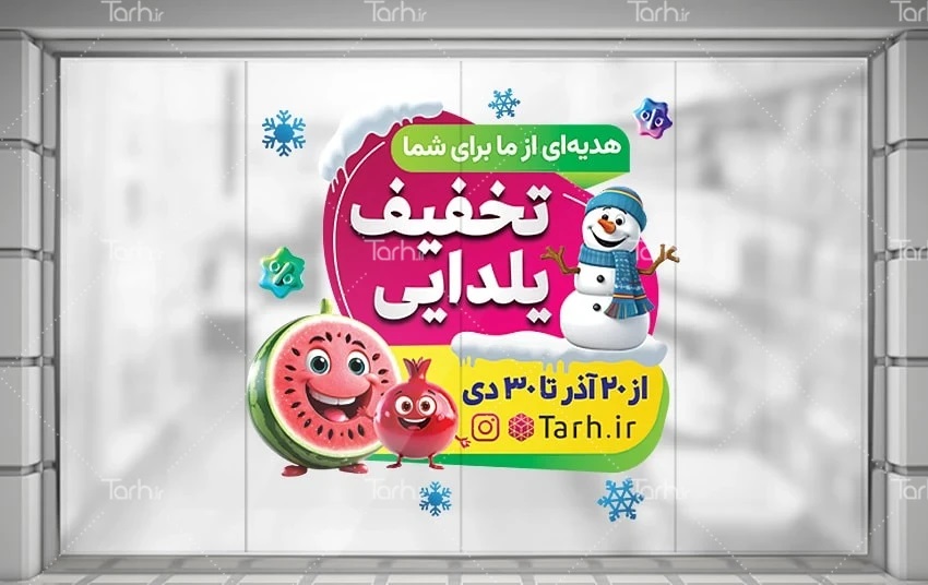 دانلود طرح برچسب شیشه فروشگاهی و استیکر تخفیف شب یلدا باز از tarh.ir